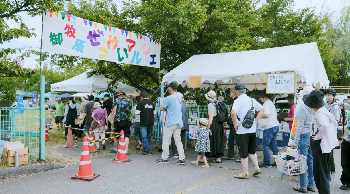 御牧原の名産であるトウモロコシや馬鈴薯、たくさんの新鮮野菜の他、ワークショップや子どもたちの手作りゲームコーナー、